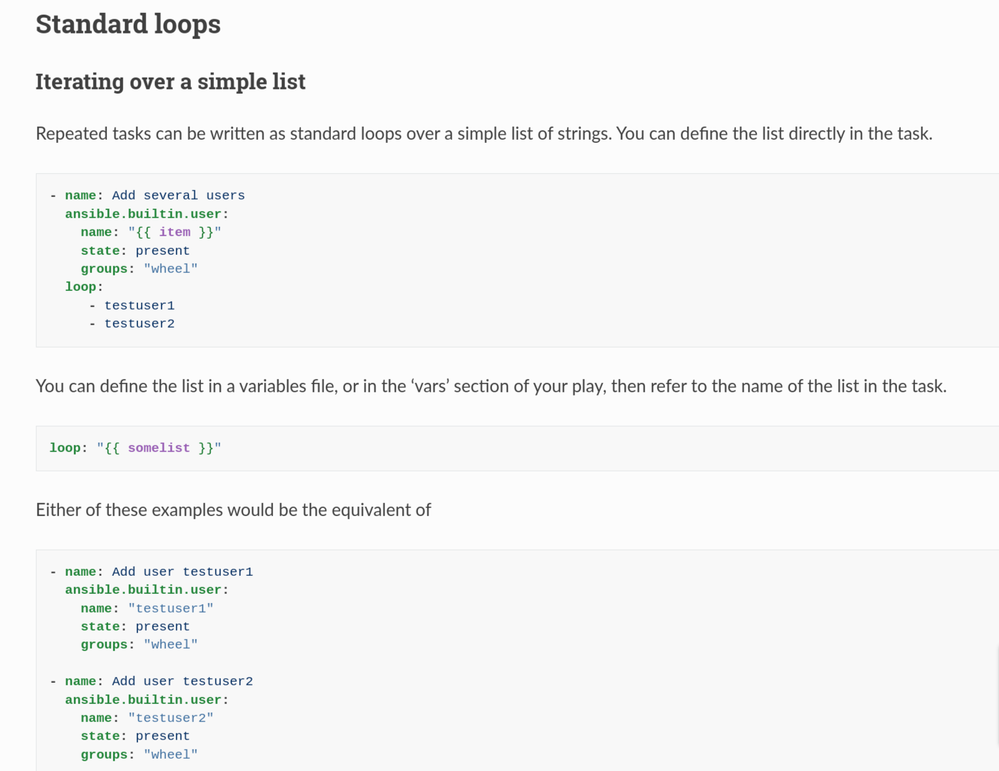 means that : name: "{{ item }}" with  loop: "{{ users }}" will create a loop ( iterate over ) over the items in the  users  variable. It will run for the number of items in the users list - here 3 times - lisa, lucy & lori.