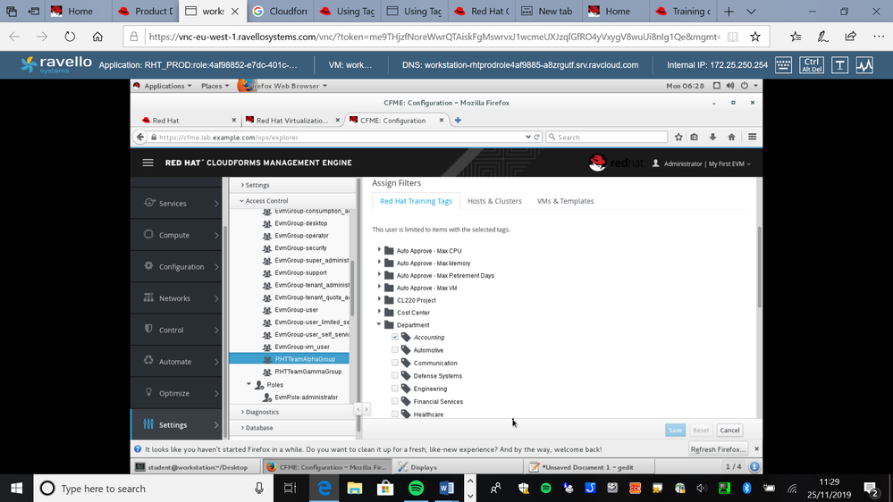 For info I'm usng the lab from the CL220 course, but have been trying to extend myself by trying other scenarios. The kind of thing I'm tryng is described in a link https://cloudformsblog.redhat.com/2016/10/13/using-tags-for-access-control