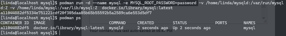 $ podman run -d --name mysql -e MYSQL_ROOT_PASSWORD=password -v mysql:/var/lib/mysql docker.io/library/mysql:latest