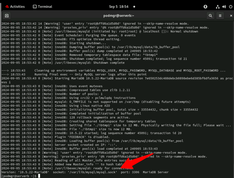 So for Podman you really should use (registry.redhat.io/rhel8/mariadb-105) image as its made for podman, rootless support, selinux etc..