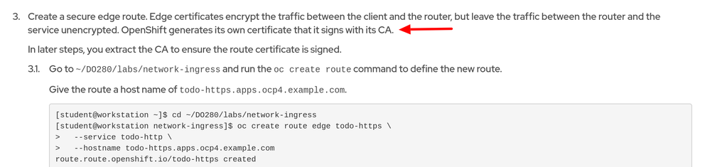 [student@workstation network-ingress]$ oc create route edge todo-https \ > --service todo-http \ > --hostname todo-https.apps.ocp4.example.com