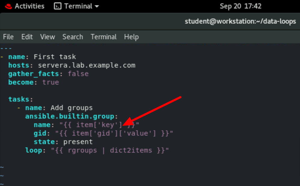 The crux is - The correct way to access the groups value in the item is {{ item['value']['groups'] }}. The item['value'] key will return the entire value of the item, which is a dictionary. The structure we have defined in our dictionary follows this pattern, with 'value' as the key to access the sub-dictionary and 'gid' as a subkey to retrieve the GID.