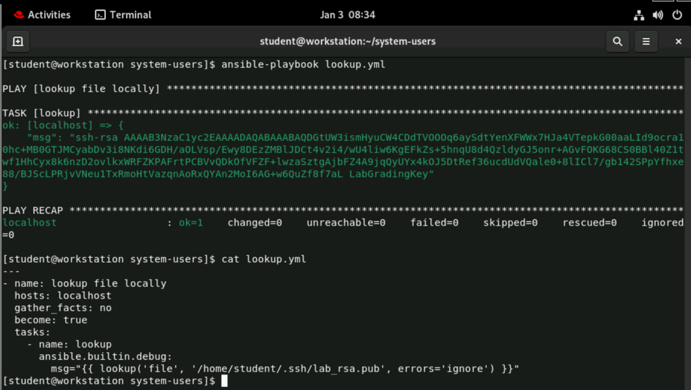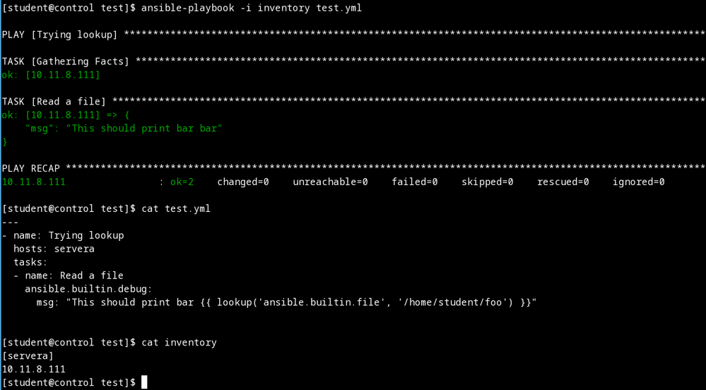 msg: "This should print bar {{ lookup('ansible.builtin.file', '/home/student/foo') }}"