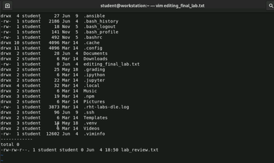 Step 1: On workstation, create the lab_file shell variable and assign editing_final_lab.txt as the value. List the student home directory, including hidden directories and files, and redirect the output to the editing_final_lab.txt file by using the shell variable.