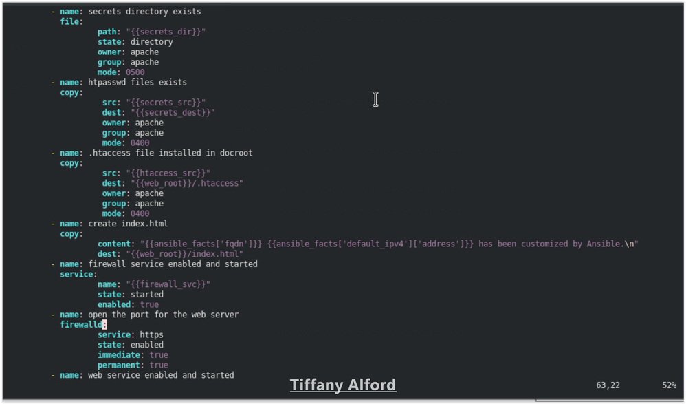 Here is a screenshot of the entire playbook, I can't seem to find my error, though I think it has something to do 'Create index.html' task but I'm not sure what to do to fix it. Any help or suggestions would be greatly appreciated!