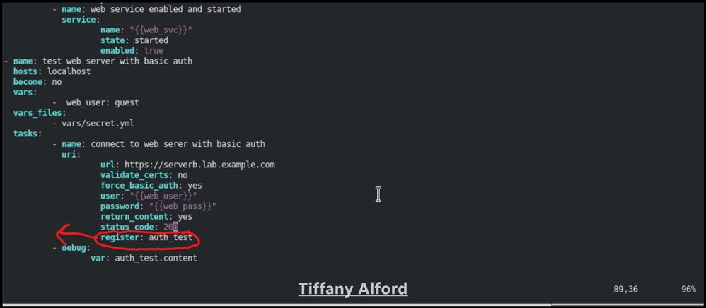 I've been struggling for nearly 2 hours trying to figure out where my mistake is in this lab. After creating the playbook and running the play, I keep receiving the message "auth_test.content": VARIABLE IS NOT DEFINED! on the debug task. I took a screenshot; it is the last task performed.