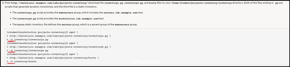 What you are asked to do with -O (uppercase) is redirect the file obtained using wget to another file. It's basically like "downloading the file and saving it as a file called inventorya.py (under the directory called inventory)".