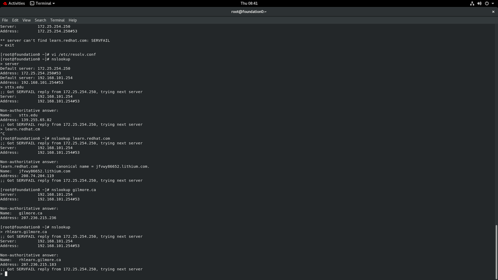 When I test it using nslookup rhlearn.gilmore.ca, it will return server fail. Server Fail Respond