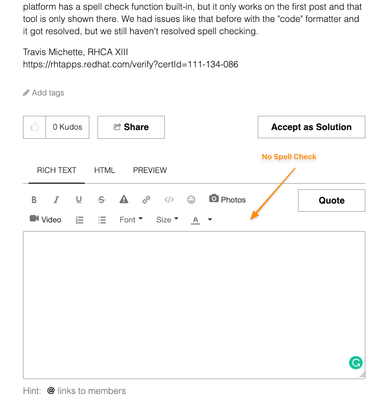 Spell Check for Reply - MissingAs you can see from the screenshots, it won't spell check on a reply unless you've installed some type of browser plugin or extension. Furthermore, it is clear to see that access to the tool is unavailable for the reply editing window.