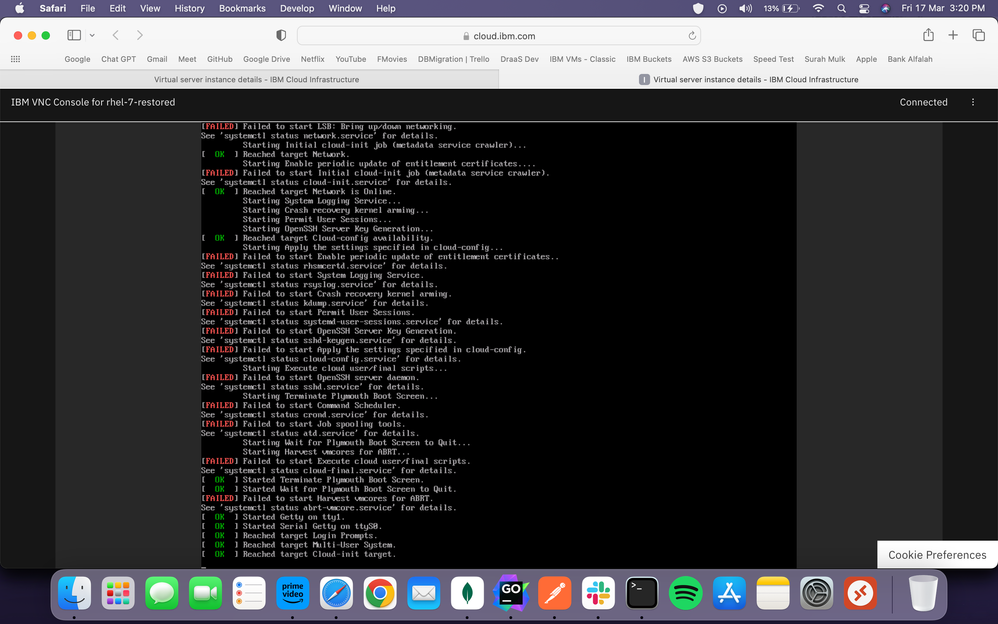 Now the problem I’m facing with this process is that when I create a new VSI using the custom image, the new VSI does not boot up. When it boots, it keeps giving me errors. Screenshots have been attached.